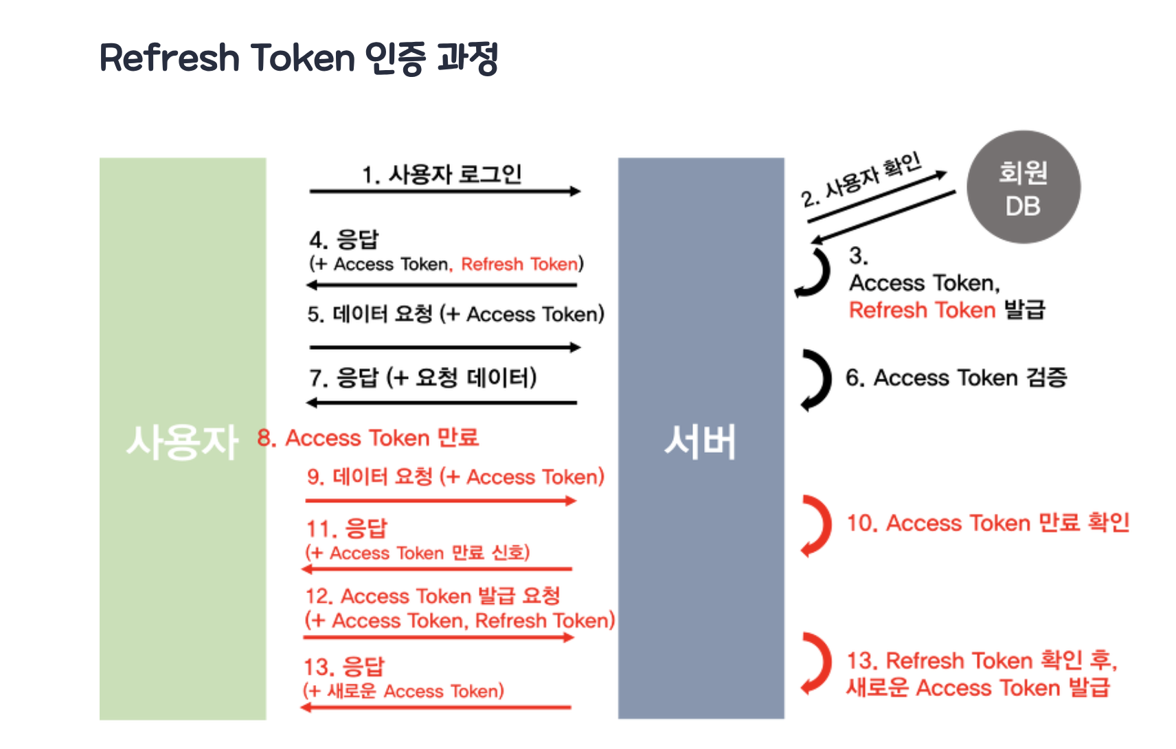 12번에서, Access token과 Refresh token을 동시에 보내지 않고, Refresh token만 보내도록 변경- 9~13번 과정을 간소화시키기 위해, 9번에서 데이터를 요청할 때, Access Token, Refresh Token을 동시에 보내도록 변경
