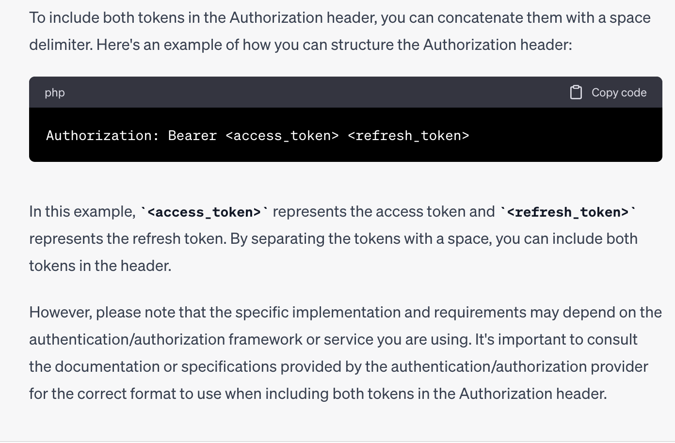 - 기존에는 Authorization header type에 Bearer를 사용하려고 하였으나, access token과 refresh token 값을 모두 담아야 하므로, Bearer type 하나로는 부족하다는 생각이 들었다.