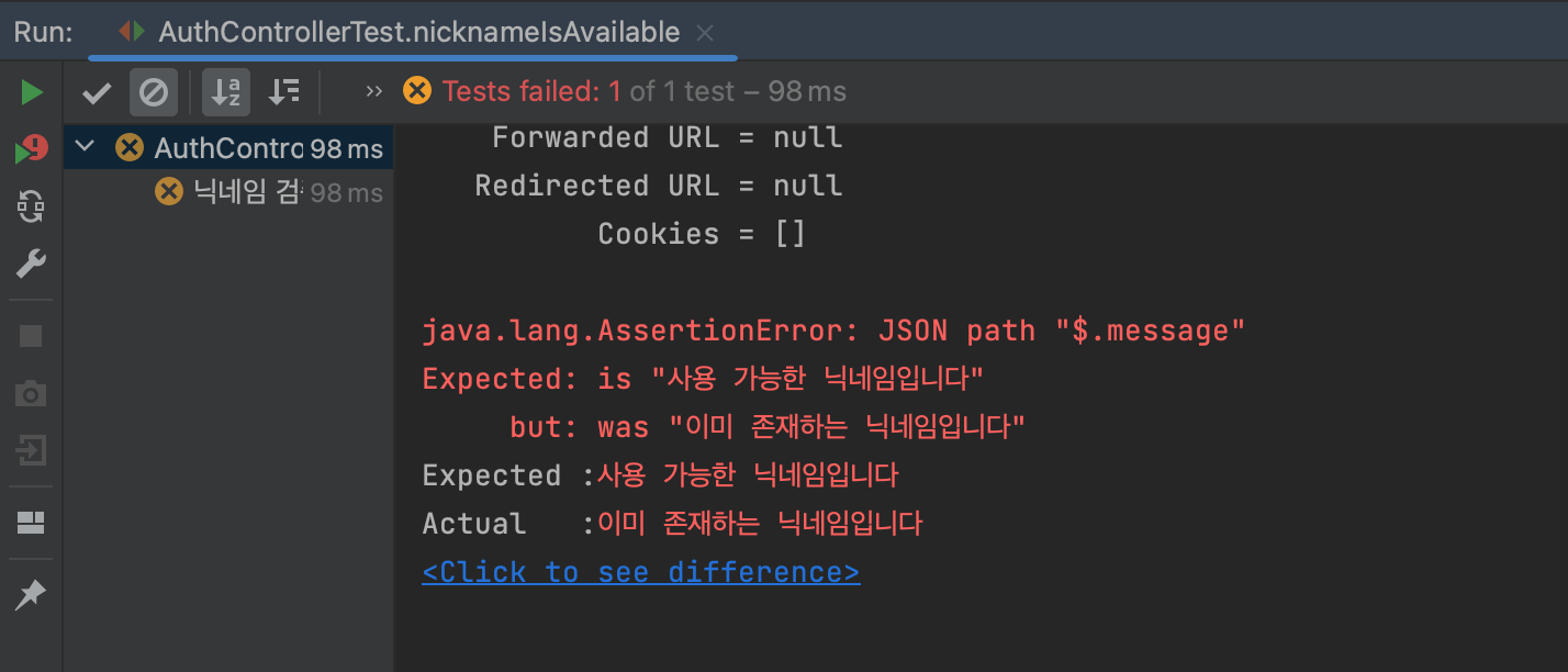 - AuthController에서, httpStatusValue 값을 System.out.println() 으로 출력하도록 한 뒤, AuthControllerTest에서 실행한 결과, 값이 200이 아닌 0으로 나와서, else {} 구문이 실행되는 것을 확인하였다.