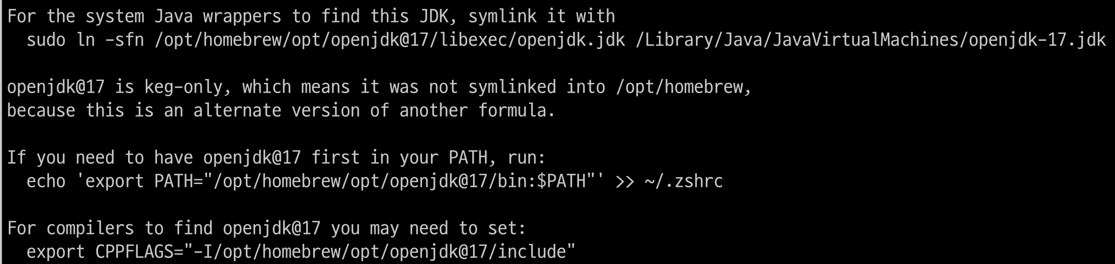 brew install openjdk@17 명령을 통해 java 17을 설치하였는데, 설치 이후 아래처럼 심볼릭 링크를 등록하라는 내용이 뜬다.