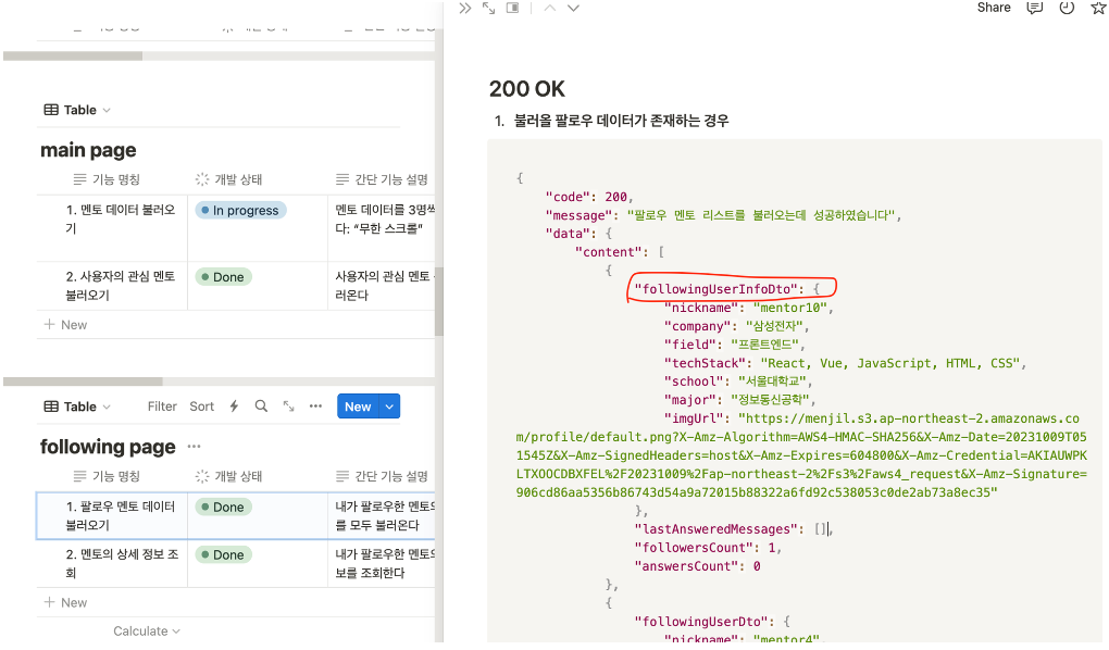- 단적인 예로, Response 양식에서 Dto 객체 명을 followingUserInfoDto에서 followingUserDto로 변경하였는데 API 문서에 업데이트하는 것을 빠뜨려서, 프론트 측에서 데이터를 제대로 받지 못하는 문제가 발생하였다. (아래 사진)